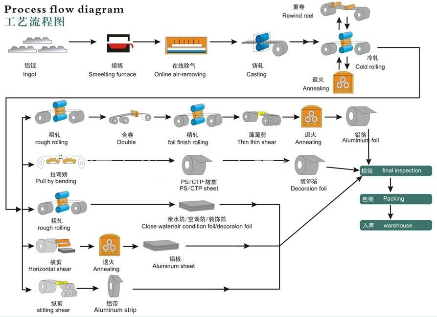 Ingot + Master Alloy → Melting → Holding Fumace → Continuous Casting → Cold Rolling(Mediate Annealing) → Horizontal shear → Annealing → Aluminum Sheet