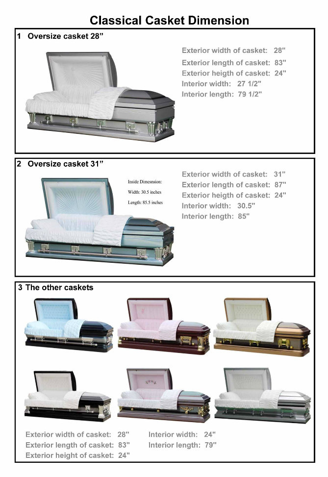 Casket Features: 1. All the paint come from PPG. PPG Founded in 1883 as Pittsburgh Plate Glass by Captain John B. Ford and John Pitcairn and in Pittsburgh, Pennsylvania. Today, PPG is a global supplier of paints, coatings, optical products, specialty materials, glass and fiber glass 2. Stainless steel is 304 with material certificate. Many use cheap substitutes. 3. Bed mechanism equipped with all 18G up. Both tilting and height adjustment. 4. Pillow is 100% polyester. Far more firmer and stronger. 5. Automotive paint finish. 6. GENUIE continuous welded bottom including joints. 7. Lugs are casting heavy metal. Not plastic or thinly stampedwill not cracking or breaking. 8. One piece polypropylene injection-molded gasket. Not extruded. Bridge is not a hollow tube just for the look. 10. Embossed brushed finish. Comparable to finish on stainless steel fridge. Not done by sandbags manfully and will not rust in 9 months. It's done in a temp and humidity-controlled environment with a designed process, not by adding dehumidifiers.