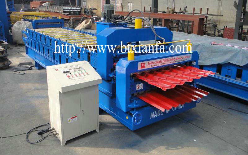 IntroducationMachine consist of uncoiler and its base, coil sheet guiding equipment, roll forming system, post cutting equipment, pressing equipment, post-cutting system, hydraulic station, controlling system, supporter table.Machine Feature:1. Precise forming2. High-solid forming stand guarantees the goods and uniform high quality of final productd3. The operation automatically minimizes the tolerance of cutting lengthProducts Feature:1. A stylish and attractive design, giving the apperance of a traditional roof tile.2. Resistant to frost, heat, hail and gales; 100% waterproof, due to the lateral run-off channel on each sheet for several models.3. The raw material can be in different color, with elegant and noble looking. It is widely used as the garden like factory, hotel, exhibition, villa, civil construction etc.Components and Technical Specification1. Manual UncoilerUsage: It is used to support the steel coil and uncoil it in a turnable way. The steel coil is uncoiled by hand. Loading capacity: 5TInner diameter: 500-508mm2. Feeding TablePut the raw material(steel plate) through the beach to manufacture and process, it can guarantee that the products are neat, parallel and everything is uniformity. Please refer to the equipment regulation to know the function of locate angle iron.3. Hydraulic SystemPower: 4kw, Hydraulic oil: 40#Hydraulic oil into the hydraulic oil tank, the pump drive the cutter machine to begin the cutting job.4. Computer Control CabinetThe target piece`s length is adjustable and digit of it can be adjusted. Computed mode has two modes: Automatic and manual one. The system is easy to operate and use.PLC: EURA5. Cutting System:It adopts the hydraulic drive and automatic location to decide the dimension and cut the target products.Material of blades: Cr12, quenching treatment6. Output TableIt adopts welded steel and supported roller to transmit the products, which is used to collect the finished products.Main Roll Forming Machine:Material of rollers: 45# steel, roller surfaces polishing, chrome hard plating, The polished surface and the heat treatment towards the molds also can keep the molding plate surface smooth and not easy to be marked when it is being stamped.Two in one Roof Sheet Roll Forming Machine